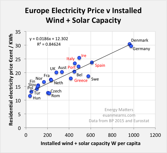 Figure 5. Figure by Euan Mearns showing relationship between installed wind + solar capacity and European electricity rates. Source Energy Matters.