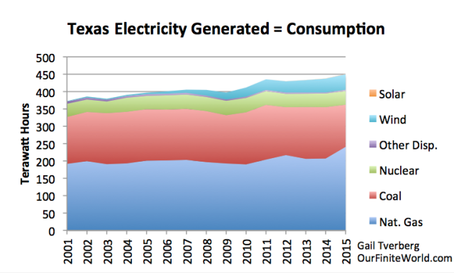 In 2015, total intermittent electricity from wind and solar amounted to only 10.1% of Texas electricity. Solar has never been large enough to be visible on the chart–only 0.1% of consumption in 2015. The total amount of intermittent electricity consumed in Texas is only now beginning to reach the likely 10% to 15% limit of operational reserves. Thus, it is “behind” Hawaii and California in reaching intermittent electricity limits.