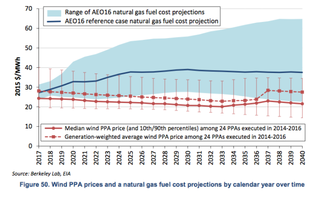 Figure 6. EIA exhibit showing the median and mean cost of wind PPAs compared to EIA’s forecast price of natural gas, from 2015 Wind Technologies Market Report.