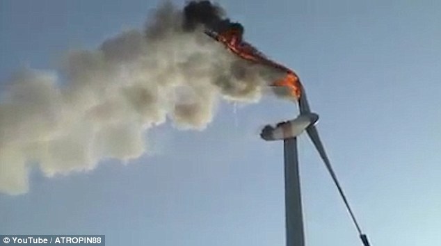 Massive wind turbine catches fire and burns for hours because German fire fighters don’t have ladders long enough to tackle the 100m high blaze