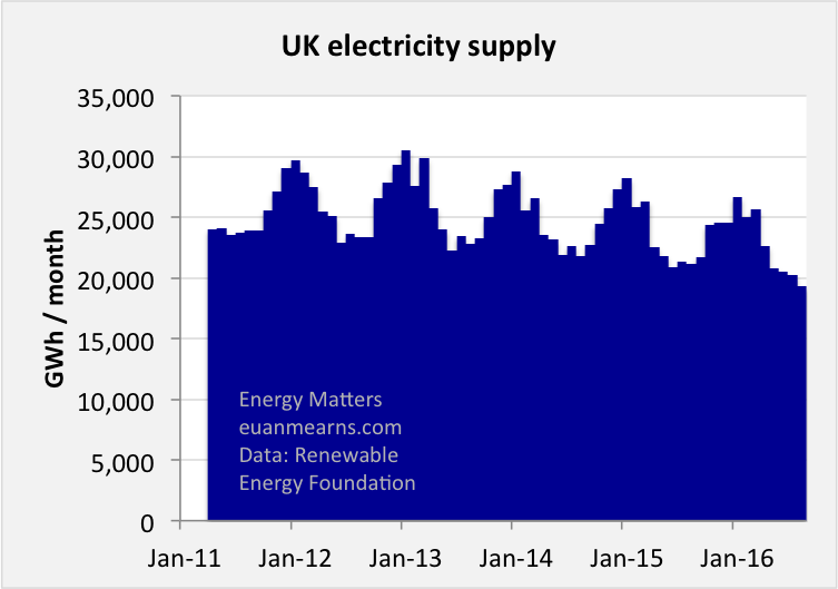 Let me begin with a look at total electricity supply that shows annual cycles with peaks centred in the winter months (Figure 1). But UK electricity supply (and demand) is falling. If we use electricity consumption as a marker of our level of civilisation and prosperity then this may give cause for concern.