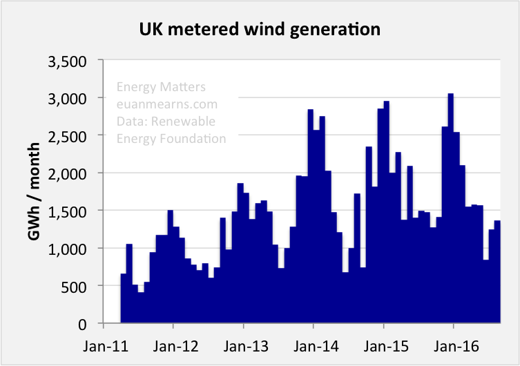 Figure 2 shows how metered wind generation has grown steadily: rapidly from 2011 to 2013 and more slowly since 2013. Only large wind farms are metered. Smaller wind farms and individual turbines are embedded in the low voltage transmission system and show up in statistics as reduced demand. Hence total wind generation is  higher than shown here. In 2015, roughly 73% was metered and 27% was embedded [3].