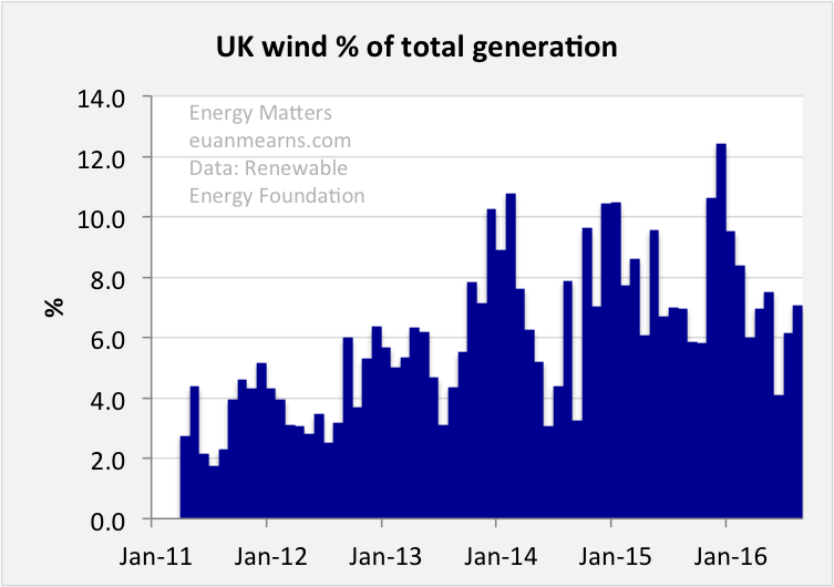 The reality is that little if any surplus UK wind is stored. The investment decision on the main but puny storage scheme at Coire Glas appears indefinitely delayed [5]. Exporting surplus wind to Europe is a fantasy, not because we don’t have sufficient interconnectivity but because when it is windy in the UK it is also likely to be windy in Europe [6] hence there will be no demand for our surplus. Atlantic depressions are continent sized. And UK hydro is woefully under-dimensioned to have capacity to balance UK wind output. UK hydro is instead used to provide some base load and some diurnal load-following capability [7].
