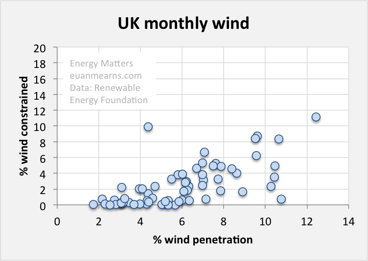 Figure 9 Finally in Figure 9 we get to the chart I want to show the most. Plotting percent wind constrained against percent penetration we see that problems absorbing wind onto a balanced UK grid begin at 3% penetration. Below 3%,  little wind is constrained on a monthly basis, above 3% in certain circumstances, some wind is constrained. Above 6% penetration some wind is always constrained on a monthly basis. Constraint has grown along with the level of penetration but the relationship is unclear,  r^2 for linear and exponential fits are similar at around 0.4.