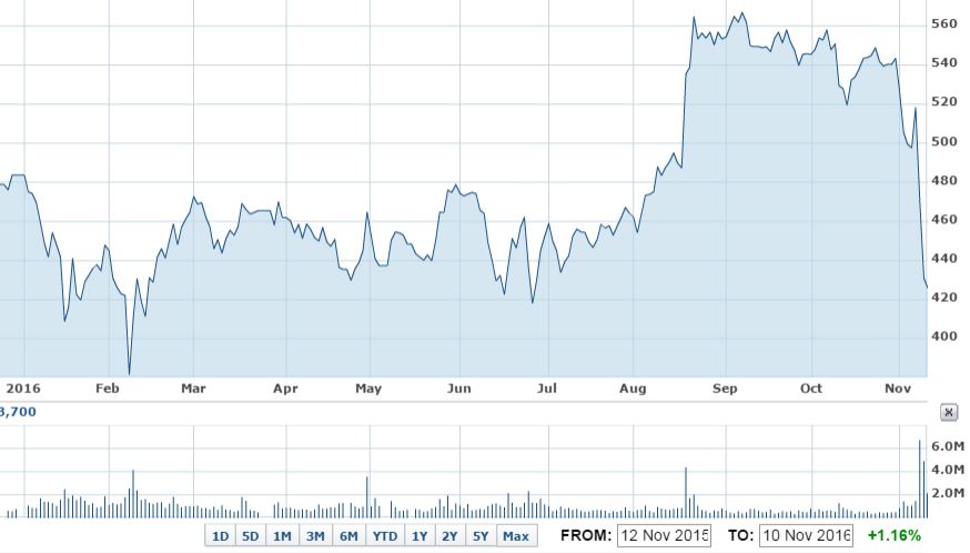 In the graph above, it’s pretty evident that in the run-up to the election investors saw Vestas as a surefire bet, given their obvious expectation of a Clinton win. However, as they say in the trenches “no battle plan survives contact with the enemy”. And the wind industry has clearly won an enemy for life in the shape of Donald Trump.