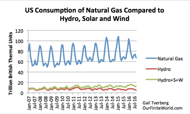 It also has a problem with not being very large relative to our energy needs. Figure 5 shows how US hydro, or the combination of hydro plus solar plus wind (hydro+S+W), matches up with current natural gas consumption.