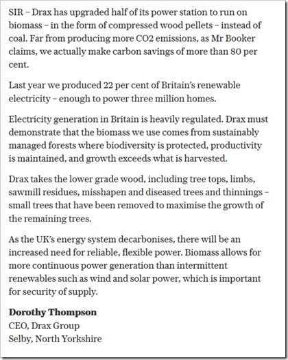 It is symptomatic of the bizarre, looking glass world we inhabit that when Christopher Booker pointed this out in this Sunday Telegraph column, the CEO of Drax Dorothy Thompson felt able to reply with this letter: