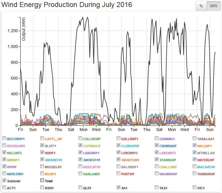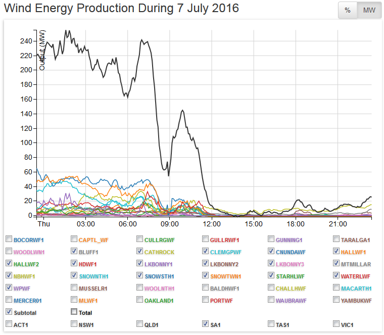 On those occasions, with the daily load in SA ranging from between 1,500 MW and up to 3,000 MW, wind power generation can represent 40-80% of that load for short bursts and, when the wind drops out, contribute absolutely nothing at all to demand for hours and sometimes days.
