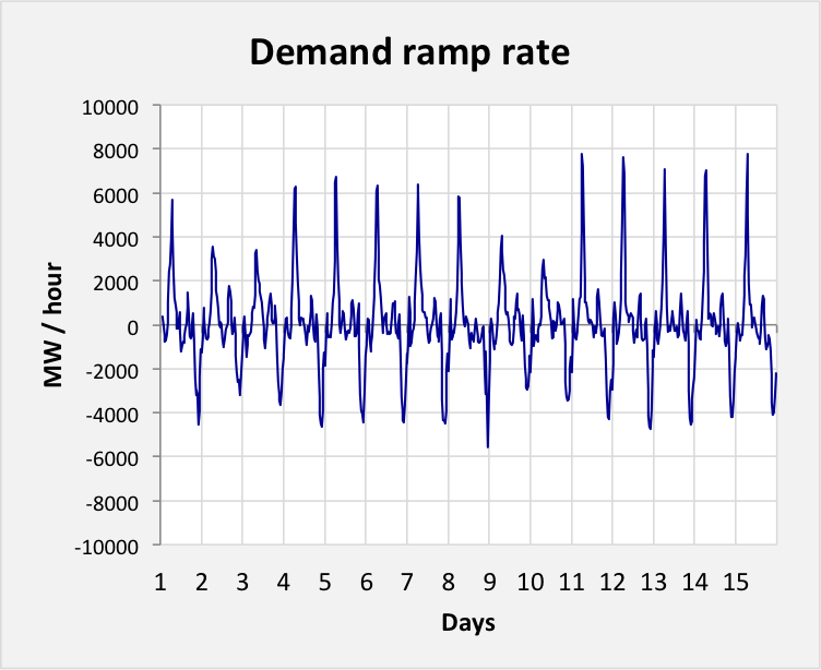 Performing the same exercise on the demand minus renewables profile (Figure 5) produces the picture shown in Figure 7. The key observations: 1) the amplitude of the positive ramp rate is not materially changed although there is one spike of almost 10 GW / hour; 2) the negative ramp rate is materially changed with an increase from -4 GW/hr to a range of -6 to -8 GW/hr and 3) during the period of high springs in the first 7 days (Figure 2) we see the need to ramp from extremes of 3 to 8 GW/hr four times per day.