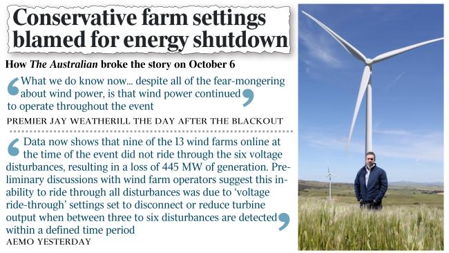Although the report said “wind turbines successfully rode through grid disturbances”, it found a “reduction in wind farm output caused a significant ­increase in imported power flowing through the Heywood interconnector” and caused it to trip, leading to the statewide blackout.