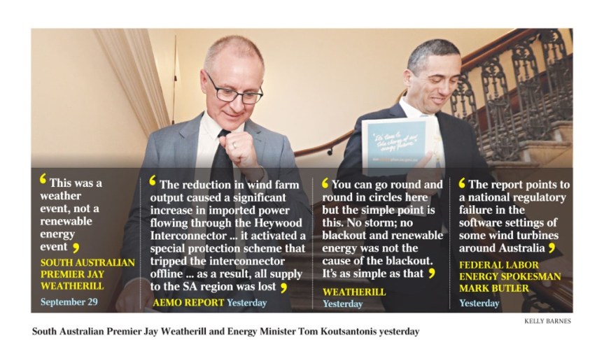Conveniently, the Premier and his sycophantic Energy Minister Tom Koutsantonis chose to ignore the report’s key findings: that control settings on nine wind farms “responding to multiple disturbances” directly led to the statewide blackout, as they tripped the interconnector with Victoria.
