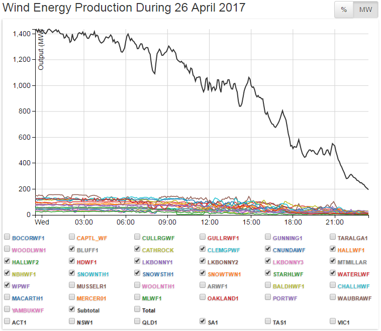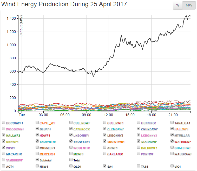 Let’s have a look at what the wind (and therefore power generation) was doing in South Australia during the month of April, thanks to the boys over at Aneroid Energy. We’ll start with the day in question, 25 April 2017: