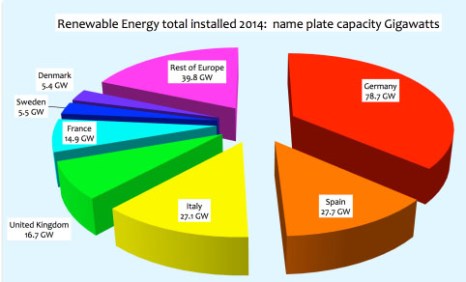 The EurObservER data from 2014 is charted below showing the nameplate installations of the different forms of Renewable Energy.
