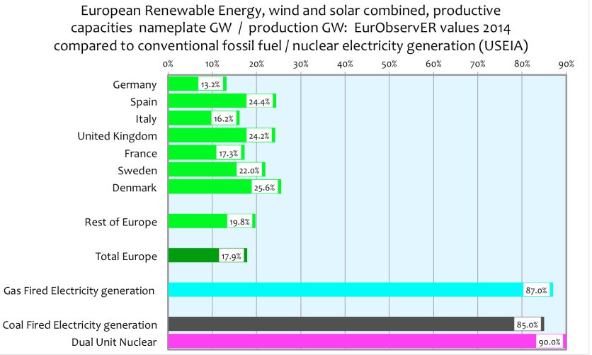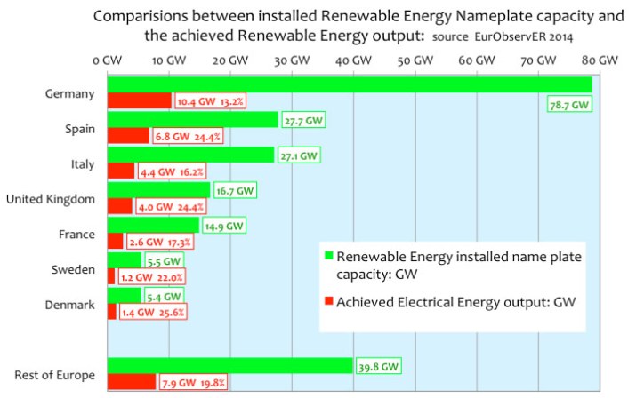 “The actual measured output by 2014 from data supplied by the Renewables Industry has been 38 Gigawatts or 3.8% of Europe’s electricity requirement, at a capacity factor of ~18% overall.”