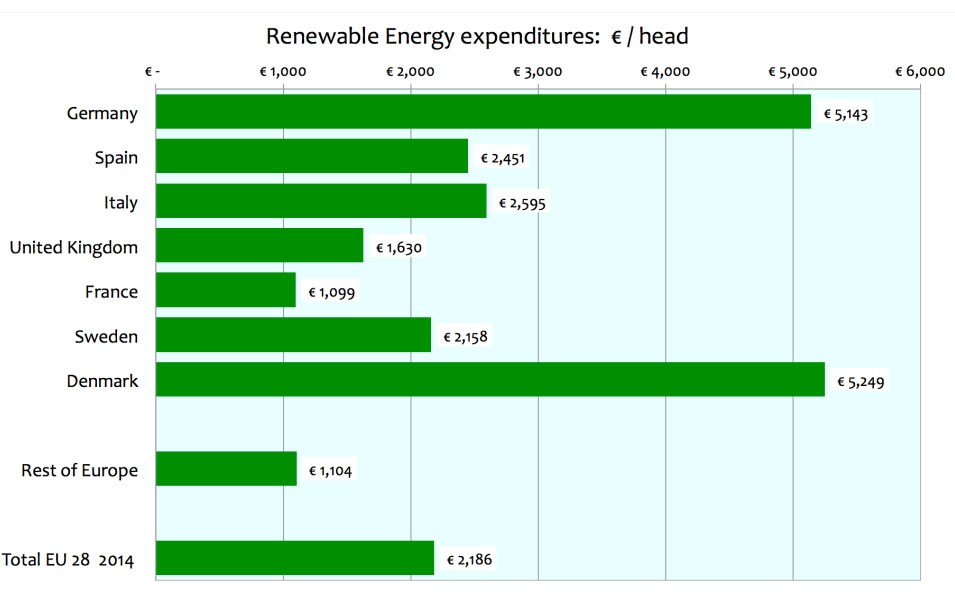 By 2014 European Union countries had invested approximately €1.1 trillion, €1,100,000,000,000, in large scale Renewable Energy installations.