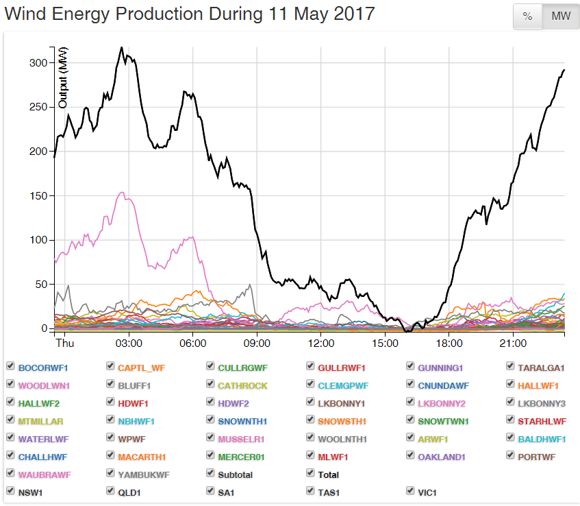 Hmmm… No, that’s not a minimalist impression of Mt Everest, that’s the entire output of Australia’s 50 wind farms spread over the South-Eastern corner of the Continent for the first 2 weeks of May.