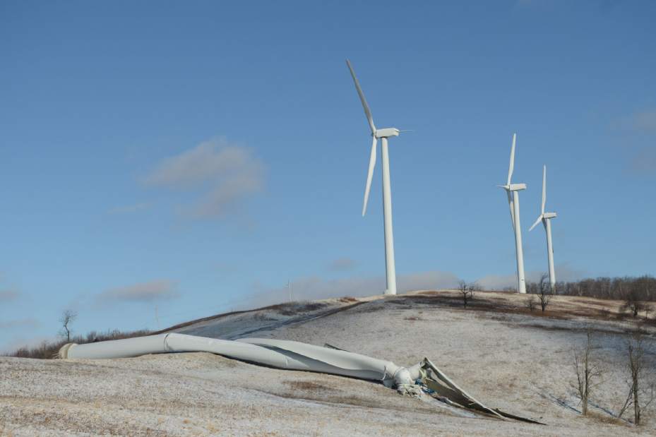 The 10 other turbines at the site, built in 2010, were not affected by the collapse, according to Renewable Energy Services Ltd., which owns and operates the wind farm.