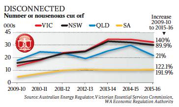 Analysis by The Weekend Australian shows that disconnection rates in Victoria rose 140 per cent between 2009-10 and 2015-16, (from 13,486 to 32,360) while in South Australia disconnections rose 122 per cent (from 4478 to 10,546) over the same period. NSW customers suffered a 90 per cent rise in disconnections (from 15,835 to 30,065), Queensland saw an increase of 21 per cent (from 17,913 to 21,667), while the ACT and Tasmania experienced moderate reductions in disconnection rates.