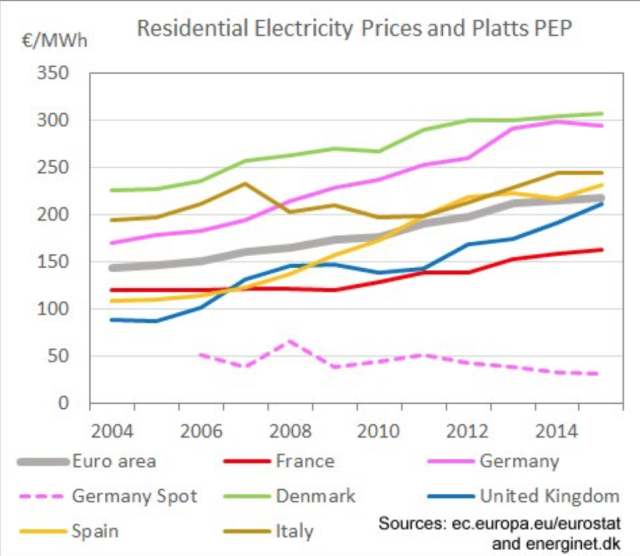 With the strange demand pattern that occurs when intermittent renewables are added, standard pricing approaches (based on marginal costs) tend to produce wholesale electricity prices that are too low for electricity produced by natural gas, coal, and nuclear providers. In fact, wholesale electricity rates for supporting providers tend to diverge further and further from what is needed, as more and more intermittent electricity is added. The dotted line on Figure 2 illustrates the falling wholesale electricity prices that have been occurring in Europe, even as retail residential electricity prices are rising.