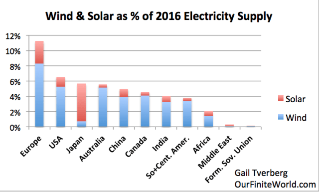 If we look at recently published information about how much intermittent electricity is being added to the electric grid, the amounts are surprisingly small. Overall, worldwide, the amount of electricity generated by a combination of wind and solar (nearly all of it intermittent) was 5.2% in 2016. On an area by area basis, the percentages of wind and solar are as shown in Figure 1.