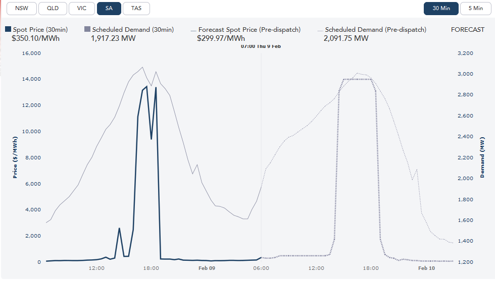 Here’s what that utterly predictable collapse in wind power output did to the spot price for power in SA (the heavy blue line on the left shows the actual price paid on 8 February, the dotted line shows the forecast spot price for 9 February):