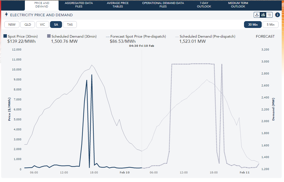 SA’s wind farms struggled to sustain 500MW for more than a fleeting moment, then, after 3pm, spiralling earthwards to around 170MW as the day warmed up, more load shedding followed and the spot price went ballistic, yet again (the solid blue line on the left shows the actual spot price on 9 February, the dotted line on the right shows the forecast spot price for 10 February):