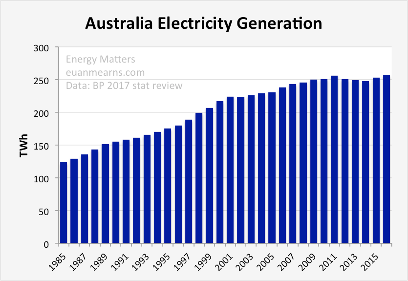 Figure 11 shows Australian coal production (blue) and consumption (red) and the large export balance (black). Peak consumption was 2008 and one has to suspect that the post-2008 decline in coal consumption has something to do with the finance crash. Looking at total electricity generation in Australia (Figure 12) we see that generation peaked in 2011 and then flattened out. I believe we are seeing a number of variables in play in Figure 11 causing Australia’s coal consumption to decline: 1) closure of 9 coal-fired power stations (Figure 10) 2) finance crash and 3) growth of subsidised wind power. This pretty well replicates the story seen in many OECD countries like the UK and the USA.