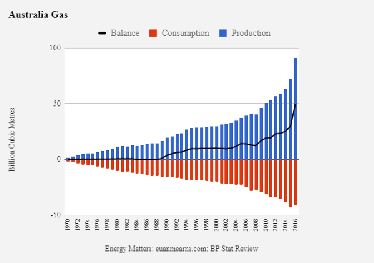 Figure 11 Chart from Energy Matters’ Global Energy Graphed data base. The blue bars = production and the red bars = consumption. The balance is the difference between the two representing either exports (as here) or imports. Australia is a major exporter of coal. The dip down in recent years reflects weakening demand for coal globally.