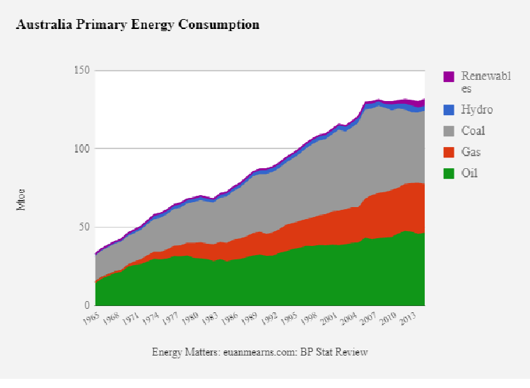 Figure 15 Global Energy Graphed. Primary energy consumption in Australia 1965-2016. Something clearly happened in 2006 to cause the trend of rising energy consumption to cease.