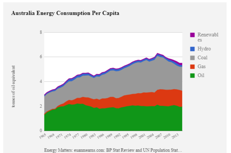 Australians have a relatively high per capita consumption which is often the case in countries that have large energy resources, and for example per capita consumption in the UK is below 3 toe per capita per annum. Australia is a big, hot, energy hungry country.