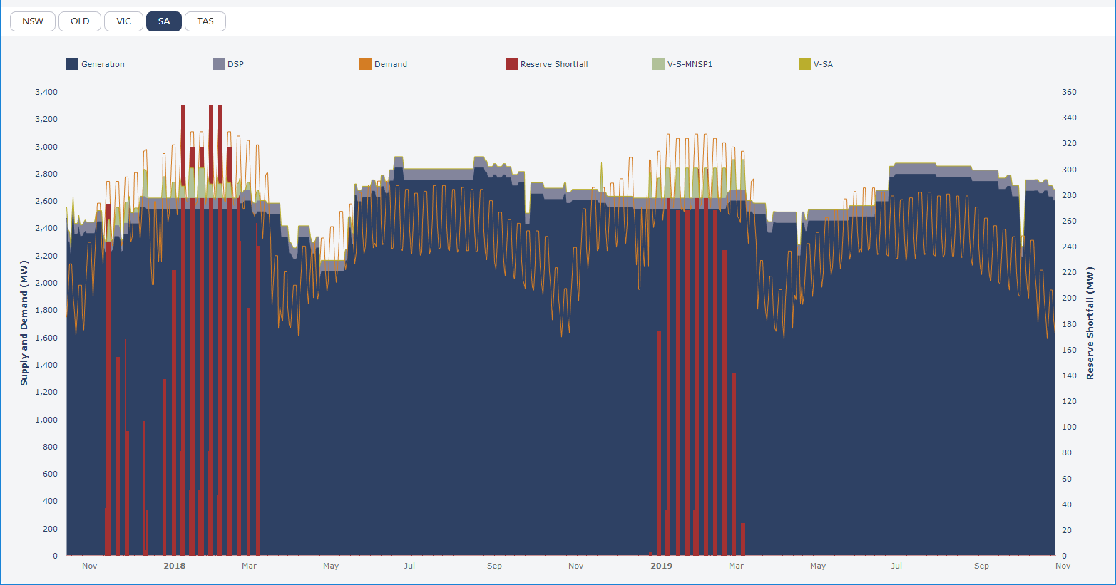 The red bars are the reserve shortfalls predicted to occur in summer next year and the year after. In itself, that doesn’t mean there will be blackouts but it means that SA is likely to be completely dependent on the interconnector to the coal plants in Victoria and the risk of blackouts is higher. SA is not self-sufficient.