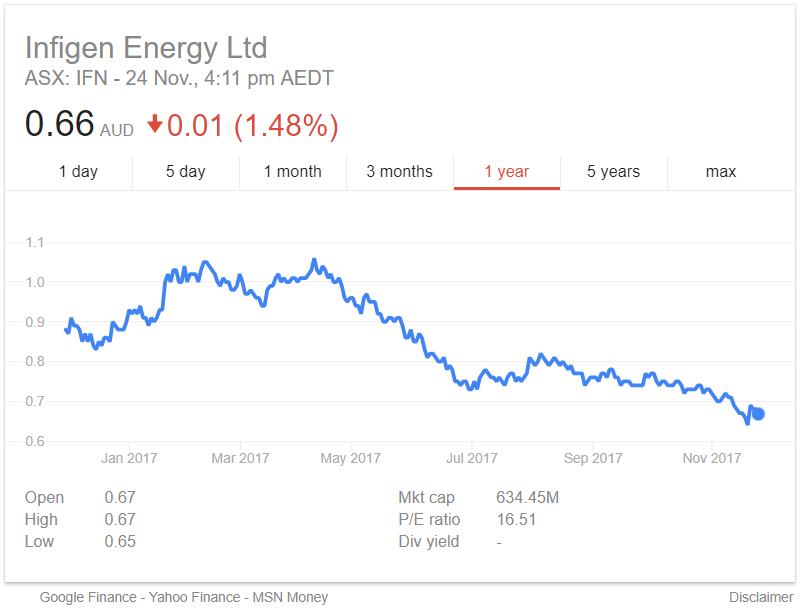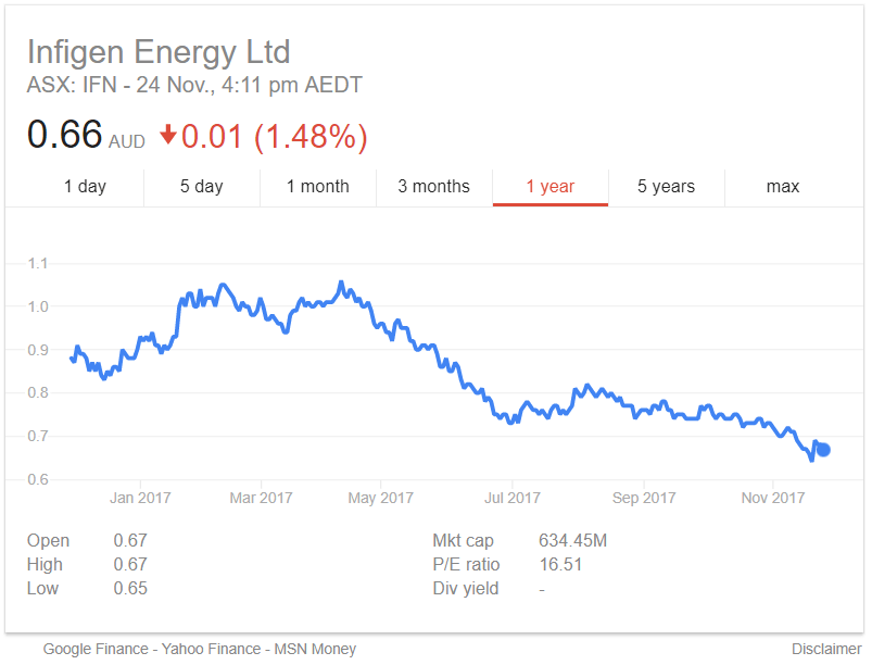 Infigen (formerly Babcock & Brown) is an all wind power outfit, which has lost investors hundreds of millions of dollars since 2009, when it Phoenixed from the wreckage of Babcock & Brown (see our post here).