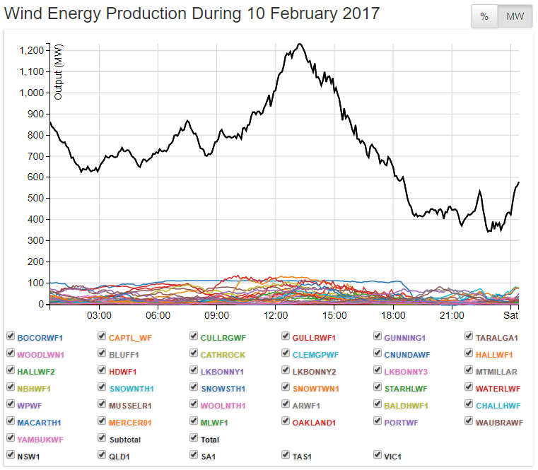 Back on the afternoon of 10 February this year, Tomago Aluminium was chopped from the grid to keep the lights and air conditioners on in NSW. Here’s what happened to wind power output across the entire Eastern Grid, that day: