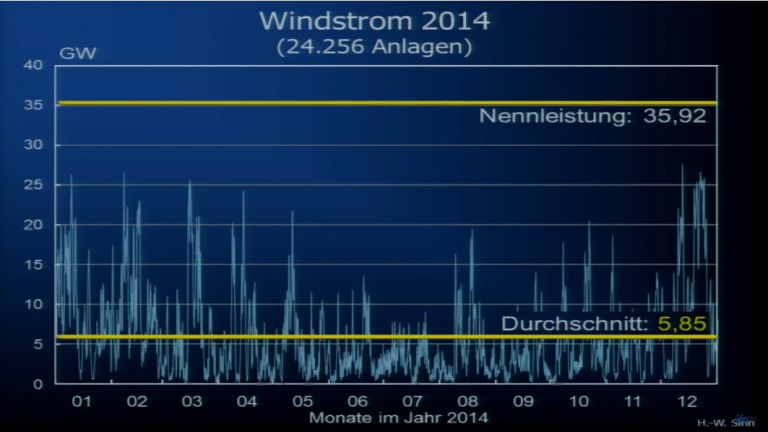 Sinn shows just how volatile wind and solar energies in Germany are, using 2014 as an exmaple. At the time Germany had installed just over 24,000 turbines with a total rated capacity of almost 36 gigawatts: