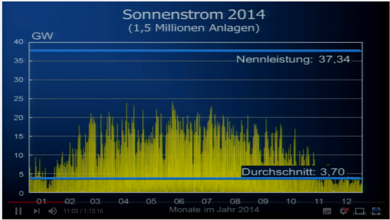 Installed in Germany in 2014 were 37.34 gigawatts of rated solar capacity. Delivered however were merely a tenth of that amount, an average of 3.70 gigawatts. What is does, says Sinn: