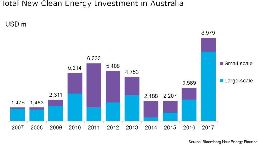 In a press release of 16 January, BNEF includes the following graphic of Australian renewable investment trends.