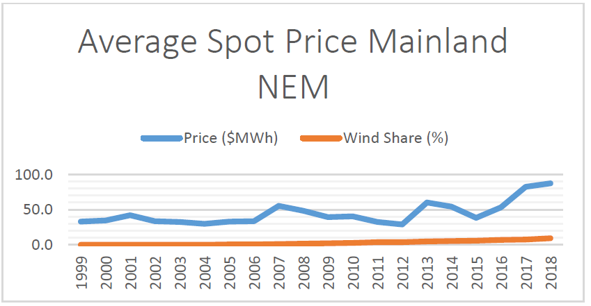 The word ‘spot’ in the line ‘Average wholesale spot price’ is a misnomer: the spot price relates to the spot market which, when wind power output collapses, often hits the regulated market cap of $14,000 per MWh; the wholesale price relates to the wholesale market, which is the price retailers pay, in aggregate.