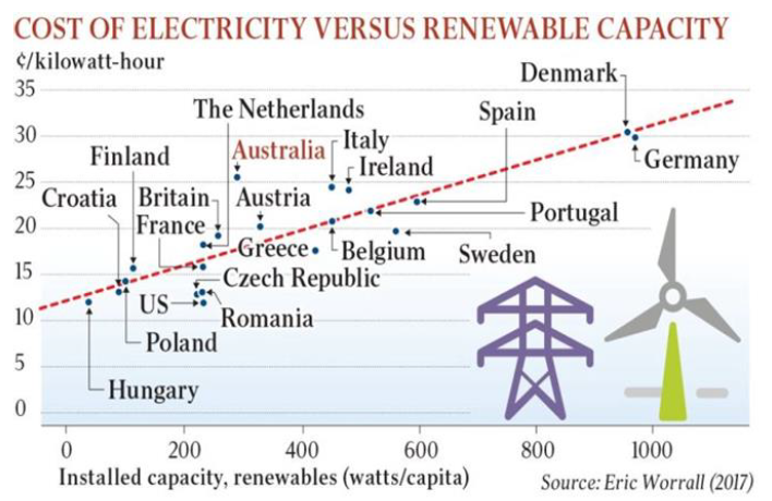 Due to its abundant coal supplies, Australia had perhaps the cheapest electricity in the world ten years ago. As a result of the renewable subsidies it is now among the most expensive. Aside from increased direct costs to households, this has immense adverse consequences for the competitiveness of Australian industries and hence the nation’s living standards.