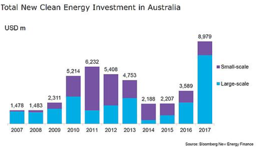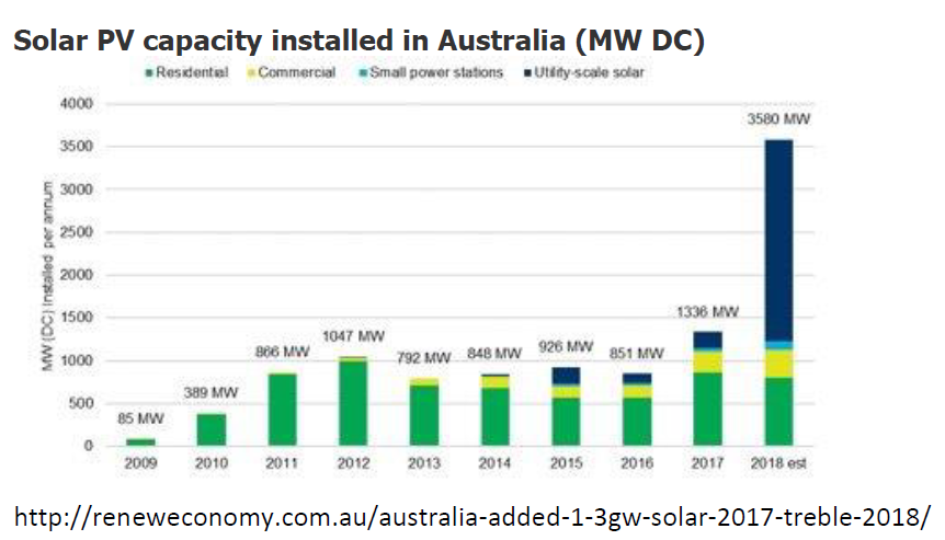 This picture may be understating the increase in small scale renewables, the installations of which are not capped and which seem to be showing an explosive growth. In 2017 installations increased by 60 per cent due to higher grid prices, lower costs and increased ARENA subsidies. 2018 installations are projected to show more than a doubling on those of 2017.