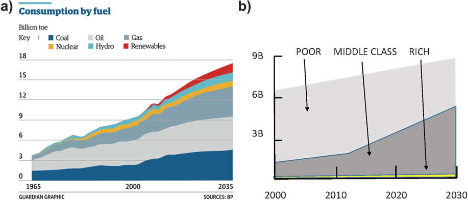 [Figure 1. (a) The 40% growth of global energy consumption since 1995 and the projected 40% growth until 2035, with most of the growth between 1995 and 2035 being provided by fossil fuels, and (b) the cause of this growth is the rise in the number of people living in the ‘middle class’ as described in the text.]Energy return on investment (EROI)