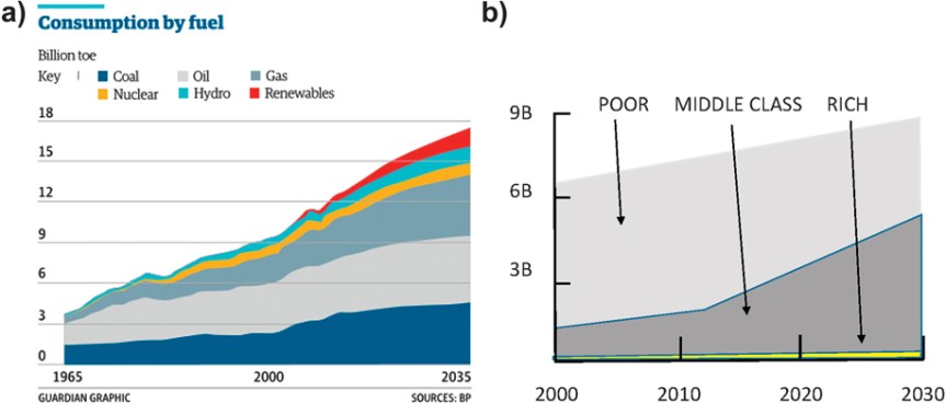 The full conundrum facing humanity can be seen with reference to Fig. 1(a), which shows that the global demand for energy has increased by 40% over the last 20 years, with over 85% provided by fossil fuels. 21 The number of people described by the World Bank as being middle class doubled from 1.5B to 3B over that period [Fig. 1(b)]. 22 The definition of middle class is minimal—such people live in a home with electricity and running water, having a refrigerator for food storage and access to modern communications to warn of any dangers, with no mention of car ownership or access to aviation, the province of the rich. Indeed the whole graph could be explained by this growth in the middle class if such people use 3.5 times as much energy as those described as poor, a figure not inconsistent with the findings of MacKay. 20 Over the next 20 years, the World Bank estimates that the middle class will rise from 3B to 5B, on the basis of which BP estimates a further increase in global energy demand of 40% still to be met in the main by fossil fuels. The graph in Fig. 1(a) is on the wrong scale to show that the total installed renewable energy capacity as of today is equal to the combined capacity of the nuclear power plants shut down in Japan and scheduled to close in Germany, making the challenge of carbon free energy impossible to meet.