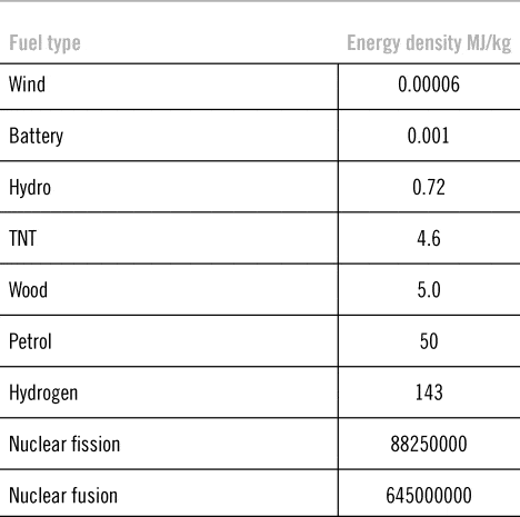 Another feature of scale needed to understand the present attempt to avoid the use of fossil fuel is the energy density of the fuel itself. Today’s fossil fuels are the result of past photosynthesis and the densification of the resulting energy over millions of years. One liter of petrol when burned releases chemical energy of most bonds as heat that is equivalent to gravitational energy of raising 36 m3 of water by 100 m in hydroelectricity terms. The actual energy density of fossil fuel is over a million times greater than gravity energy density. In turn nuclear fuels are a million times more energy dense than fossil fuels. 26,27 See Table 1.