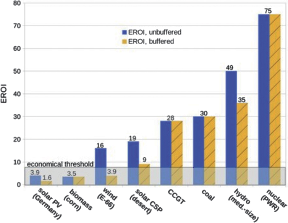 The debate over decarbonization has focussed on technical feasibility and economics. There is one emerging measure that comes closely back to the engineering and the thermodynamics of energy production. The energy return on (energy) investment is a measure of the useful energy produced by a particular power plant divided by the energy needed to build, operate, maintain, and decommission the plant. This is a concept that owes its origin to animal ecology: a cheetah must get more energy from consuming his prey than expended on catching it, otherwise it will die. If the animal is to breed and nurture the next generation then the ratio of energy obtained from energy expended has to be higher, depending on the details of energy expenditure on these other activities. Weißbach et al. 23 have analysed the EROI for a number of forms of energy production and their principal conclusion is that nuclear, hydro-, and gas- and coal-fired power stations have an EROI that is much greater than wind, solar photovoltaic (PV), concentrated solar power in a desert or cultivated biomass: see Fig. 2. In human terms, with an EROI of 1, we can mine fuel and look at it—we have no energy left over. To get a society that can feed itself and provide a basic educational system we need an EROI of our base-load fuel to be in excess of 5, and for a society with international travel and high culture we need EROI greater than 10. The new renewable energies do not reach this last level when the extra energy costs of overcoming intermittency are added in. In energy terms the current generation of renewable energy technologies alone will not enable a civilized modern society to continue!