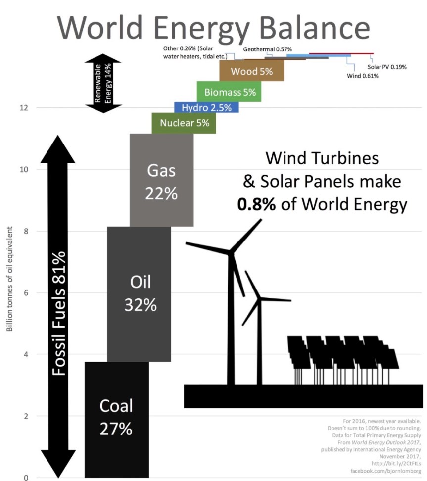 As Bjørn Lomborg points out below – at a measly 0.8% – the contribution from windmills and solar panels to world energy supplies is laughable, and, set against the work done by ‘evil’ fossil fuels, more like an accounting rounding error.