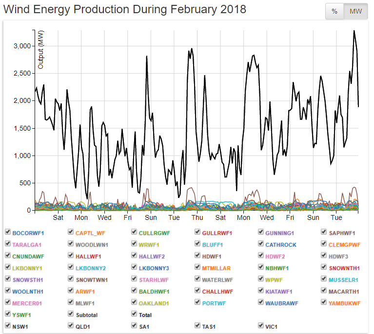 The source of the market chaos troubling Kerry Schott isn’t hard to finger (see above the combined output of every wind turbine connected to the Eastern Grid with a notional capacity of 4675 MW during February). Her solution is the National Energy Guarantee.