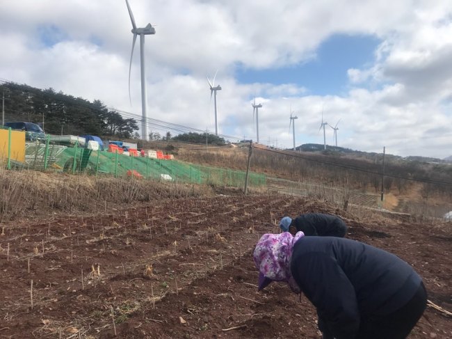 Cheon Seung-bun and her father-in-law cultivate their land across a series of wind turbines in Honggye-ri village.