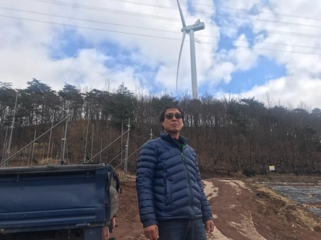 Local farmer Park Chung-lak, who grows apples in the Honggye-ri village in North Gyeongsang Province, speaks in front of his farm. Behind Park lies a 100-meter-high wind turbine that was installed as part of Korea’s renewable energy policies.