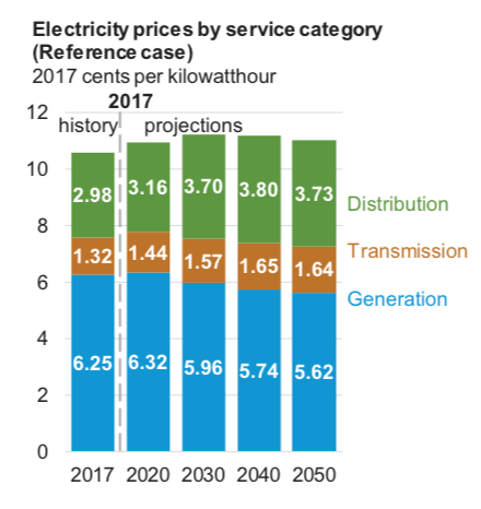 The EIA predicts that the cost of electricity will decline by 2050 due to the low cost of wind and solar.