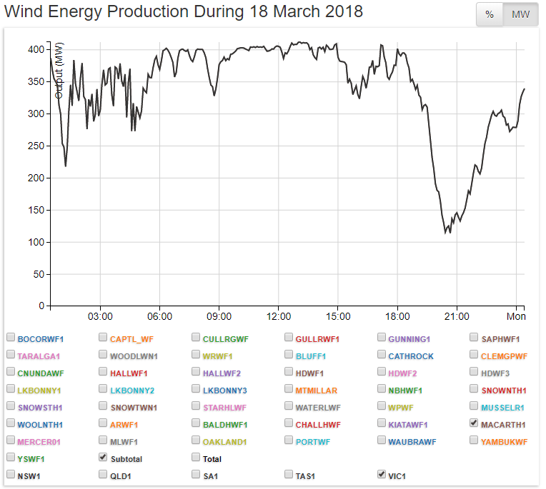 A glance at the Aneroid Energy website showed the turbines at Macarthur wind farm were operating at between 90% and 100 % during Saturday afternoon, 17th March 2018.