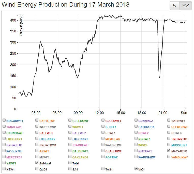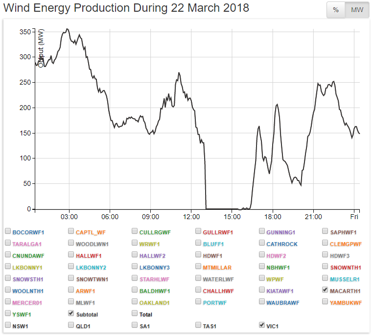 A glance at the Aneroid Energy website showed the turbines at Macarthur wind farm were operating at between 90% and 100 % during Saturday afternoon, 17th March 2018.